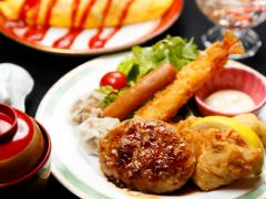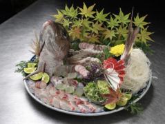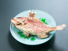 メニュー | 国産牛ロース陶板焼き / 鯛姿造里 / 焼き鯛 / 出汁巻き玉子 / 茶碗蒸し / 鯛の荒焚き / 若鳥唐揚げとポテトフライ / うどん / ホールケーキ |